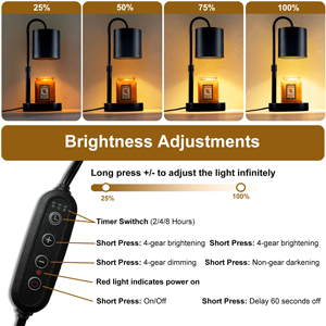 [4 Brightness Adjustment] For this candle warmer, you can increase or decrease the brightness through theaugmented symbols and reduced symbols of the button. The brighter the light, the stronger the scent, the darker the light, the lighter the scent, it can be selected according to your preference. Compared with burning candles directly, Different brightness create different atmospheres.